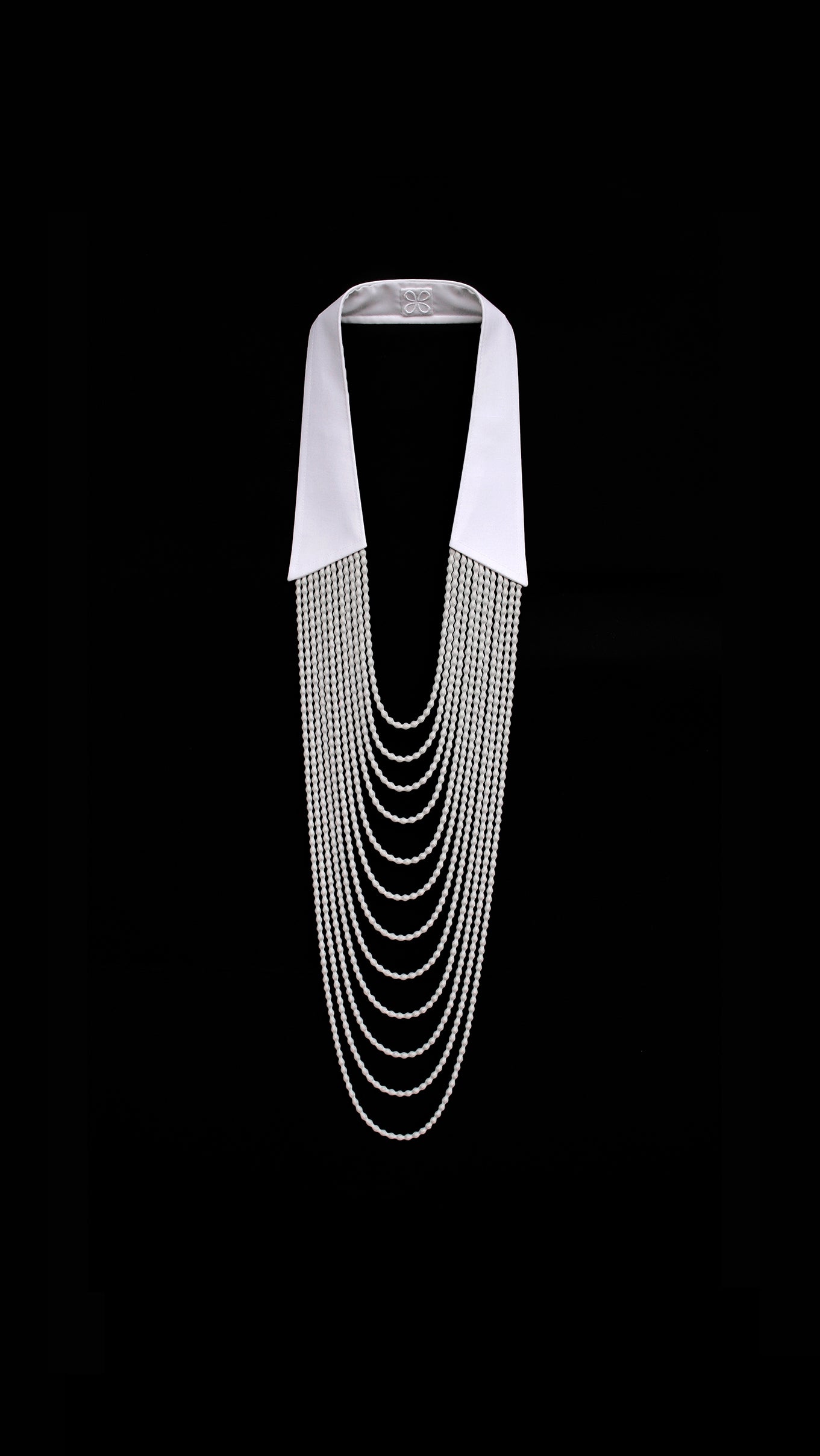Die Gegensätze Männlich und Weiblich verschmelzen miteinander. »Colliers« sind ein schlichter Halsschmuck, der von der Reduzierung des Herrenhemdes auf den Kragen in Verbindung mit dem klassischen Schmuckstück aller Frauen schlechthin, »der Perlenkette«, entstanden ist. Von schlicht zurückhaltend bis sinnlich verführend. Meine Colliers wollen bewusst getragen werden.